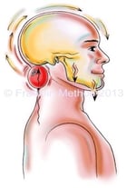 Der hintere Teil des Unterkiefers, in Gelenknähe, ist der schwerere Teil. Stell dir vor, wie dieser Teil vom Schläfenbein nach unten hängt. Oder denke, ein kleines Ballönchen (rot) schwebt unter deinem Hinterkopf und hebt ihn leicht nach oben. Gleichzeitig hängt der Kiefer entspannt nach unten. Vielleicht spürst du, wie sich die Wirbelsäule verlängert, der Nacken lang